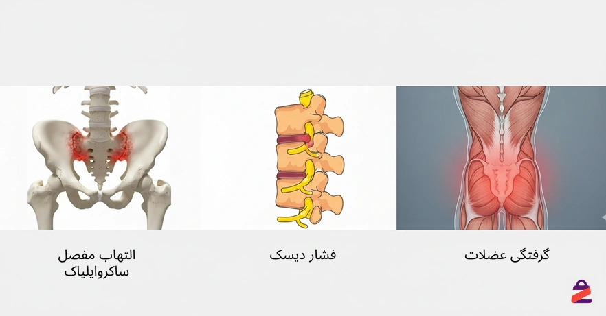 | درد عمیق، مبهم و معمولاً یکطرفه | پایین کمر یا باسن؛ تشدید با نشستن طولانی | التهاب مفصل رباط ساکروایلیاک |